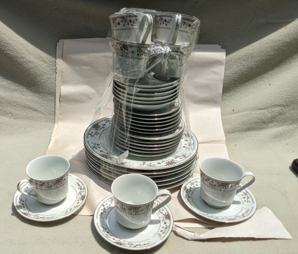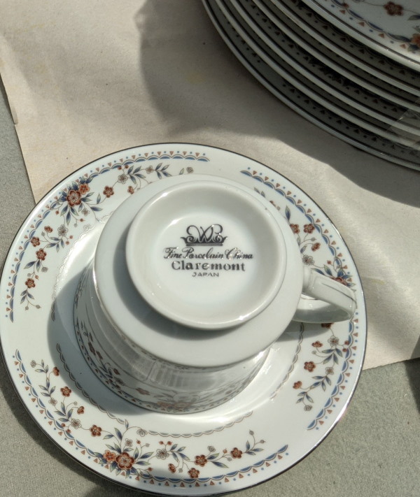 “Fine Porcelain China – Claremont Japan” complete 6 serving set of dinner plates, dessert plates, bowls, cups, saucers + 3 extra cups/saucers. Excellent condition.