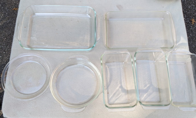 7 Pyrex dishes; 2 round, 3 small rectangular, 2 large rectangular casserole/lasagna – A household essential.