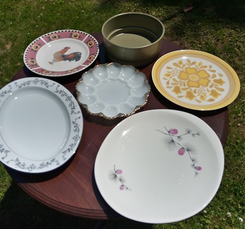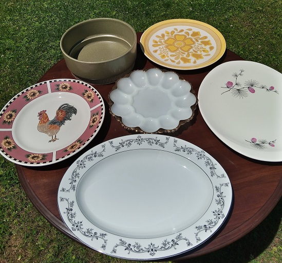 2 turkey platters, 2 round platters, 1 deviled egg serving plate, (green casserole dish not included). All good condition.