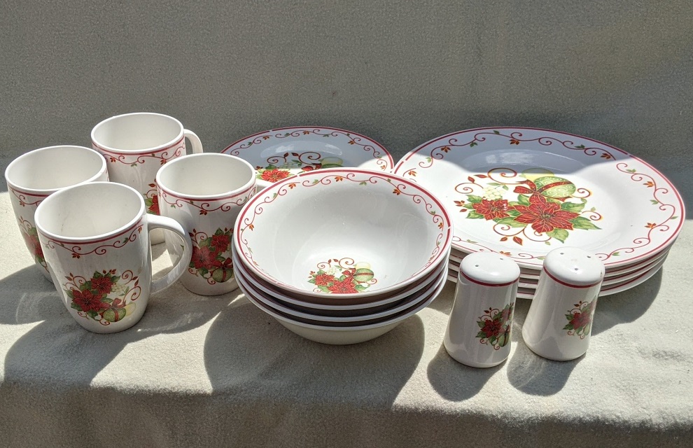 Poinsetta/Christmas pattern service for 4, includes 4 dinner plates, dessert plates, salad bowls and coffee mugs, 1 each salt and pepper shakers.