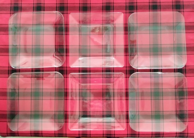 A set of 6 clear glass, heavy duty, dinner plates. Square with rounded corners.