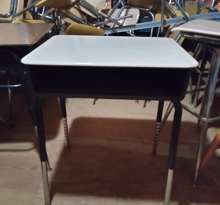 Sturdy metal student desks with dark wood grain top of tan composite top, metal legs with adjustable height, each desk has a bood compartment