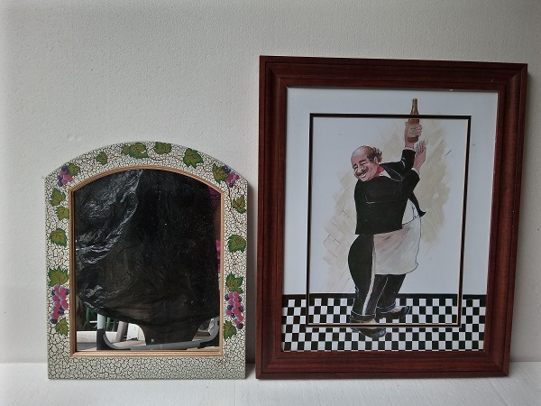 Wine server art in wooden frame (23.5″ x 19.5″), plus a decorative mirror with grapes and vines on the border (17.5″ x 14.5″). Ready for your walls.