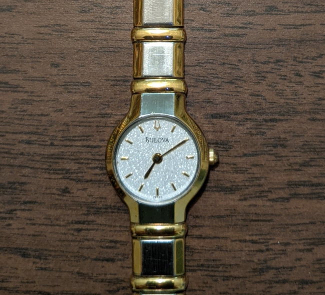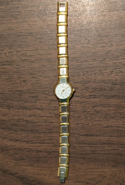 Bulova gold color w/white shimmering face woman’s wristwatch. New $12 battery included.
